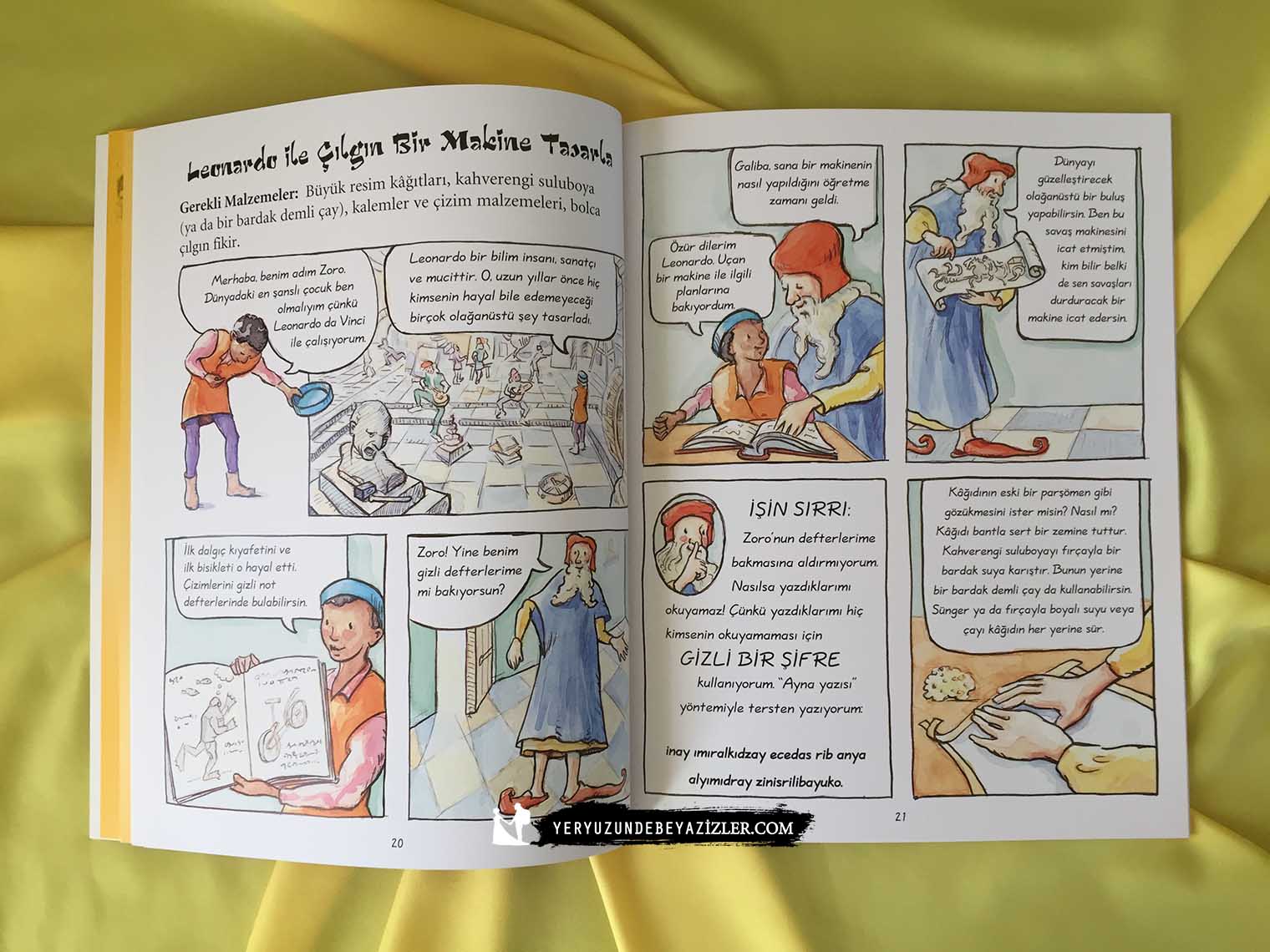Vincent van Gogh, Leonardo da Vinci, Degas, Matisse, Picasso, Monet ve Cezanne gibi saantçılar ile konuşmalar, onlar ile yapılan resimler eşliğinde devam eden çizimli ve etkinliklerin olduğu kitapta ressamların teknikleri ile ilgili ip uçları verilerek kitap sahibinin ressamlar gibi resim yapmasına yardımcı oluyor.