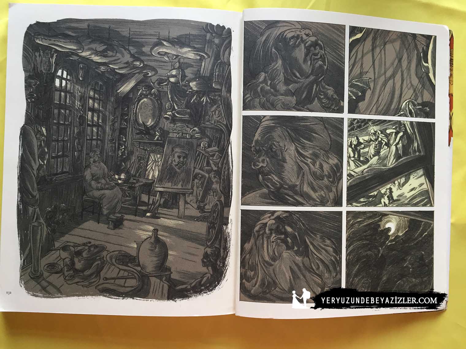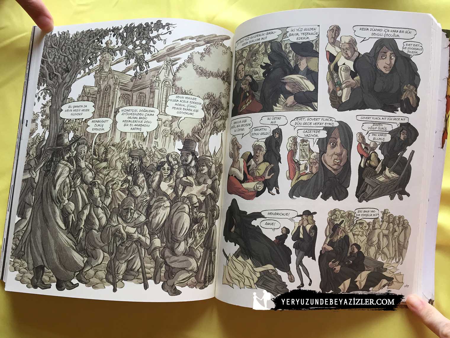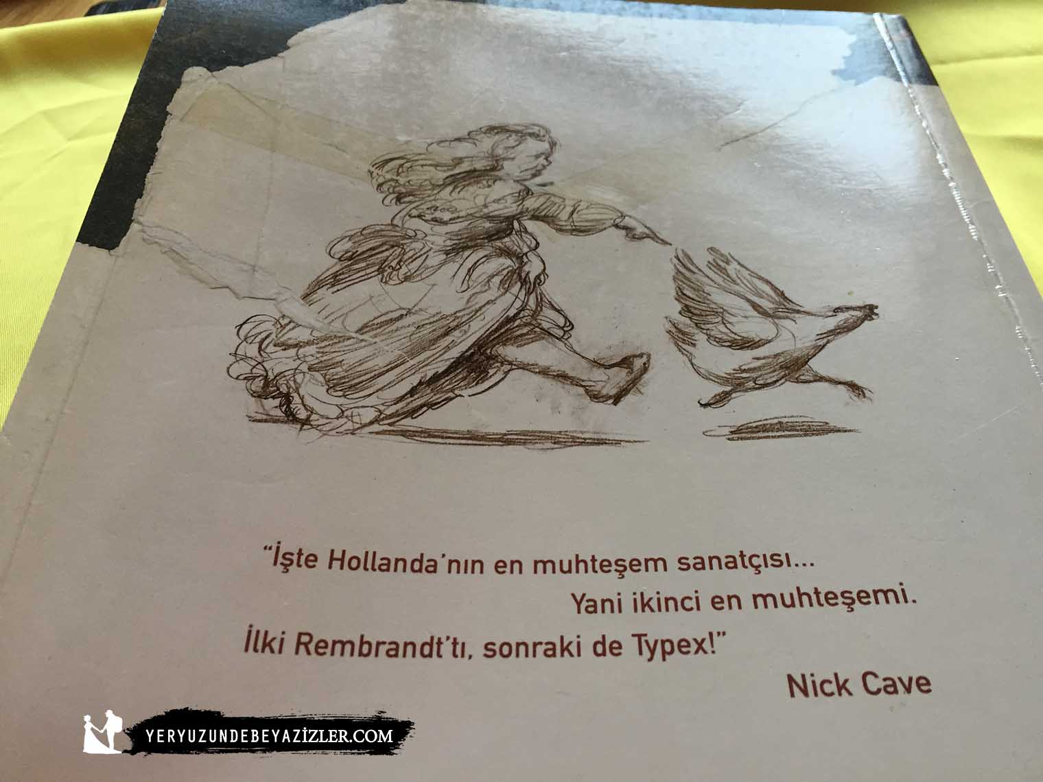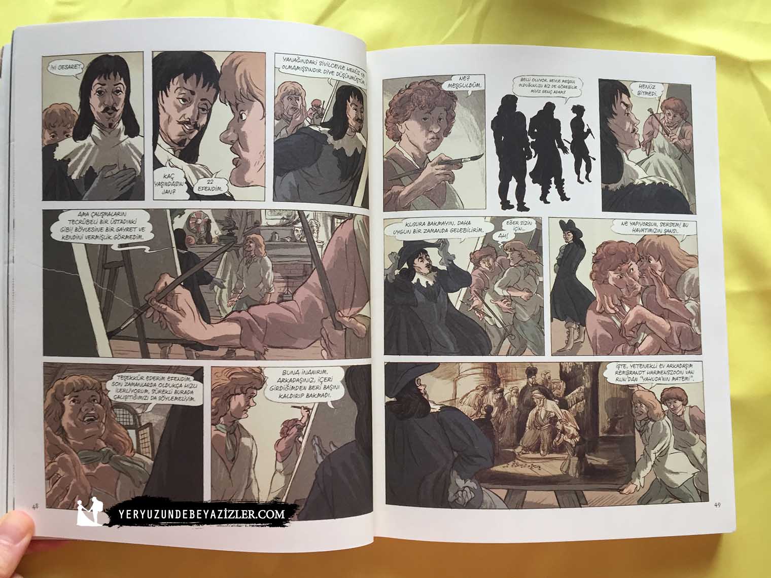 Typex, kim diye baktım ama çok bir bilgi bulamadım. Oda Hollandalı olan bir çizermiş. Çizgisi çok kuvvetli hakikaten, kitabın görselleri çok iyi, kurgusu da sürükleyici. Amsterdam’daki Rijkmuseum kitabın sponsorluğunu üstlenmiş. Typex kitabı üç yılda hazırlamış, büyük bir emek var. Hikayede biraz esnek davranılmış yani tam olarak Rembrandt’ın birebir yaşamöyküsü değil, Typex kendine göre bir Rembrandt oluşturmuş. Kendini beğenmiş, kaba ve küstah ve hatta cimri bir Rembrandt bu.